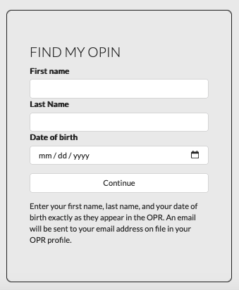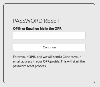 • Once do so, enter your OPIN or email in your OPR profile and select continue. You will be sent a Code to the email address in your OPR profile.